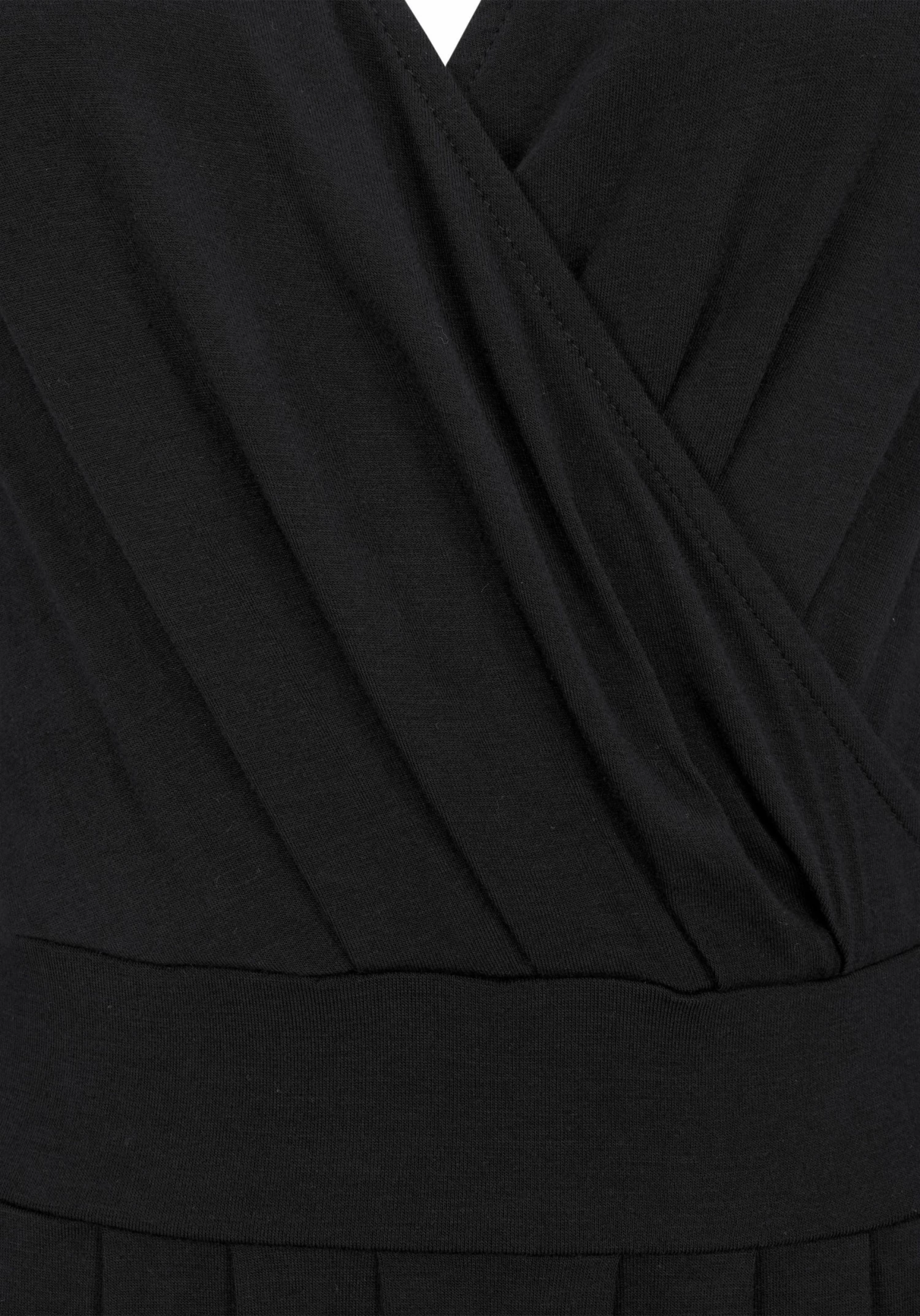 Diepe V-hals met plooien en overlappende stofbanen voor een trendy wikkeleffect. Inzet onder de buste. Rok in zwierige wijdte.<br>Lengte ca. 90 cm.<br><br>Van 95% viscose, 5% Elastan.
