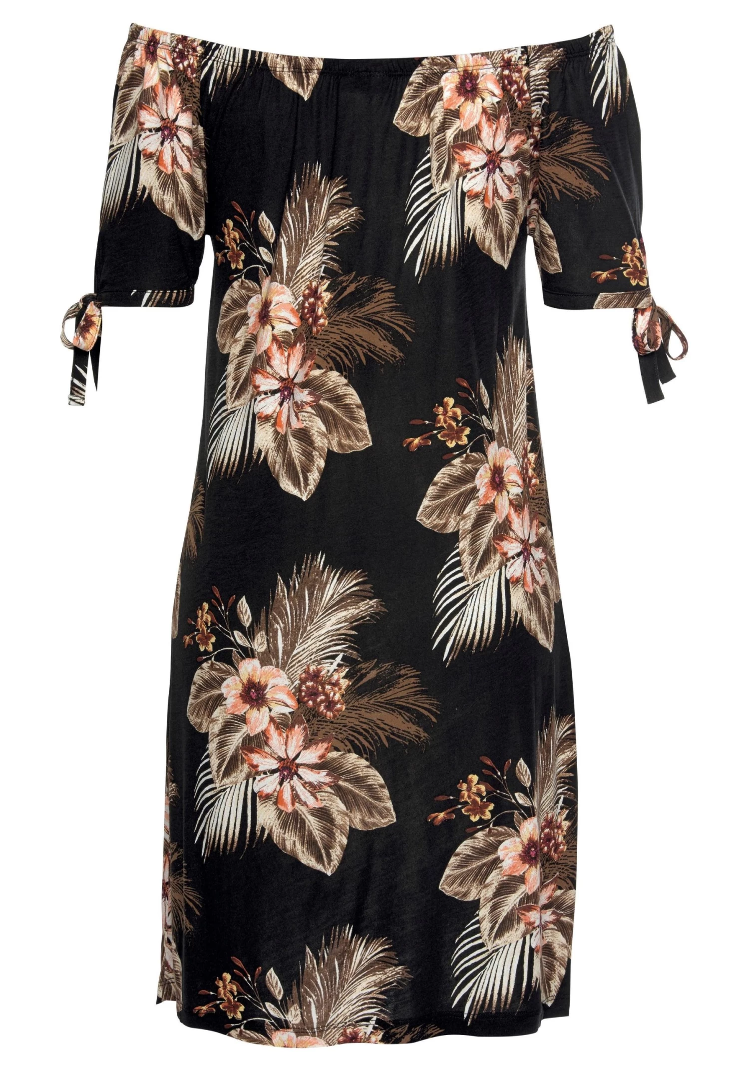 Met elastische carmenhals. Korte mouwen met bandjes die gestrikt kunnen worden. Vlot model. Elk exemplaar is uniek! Ruglengte ca. 78 cm.<br><br>Aangename kwaliteit van 100% viscose.