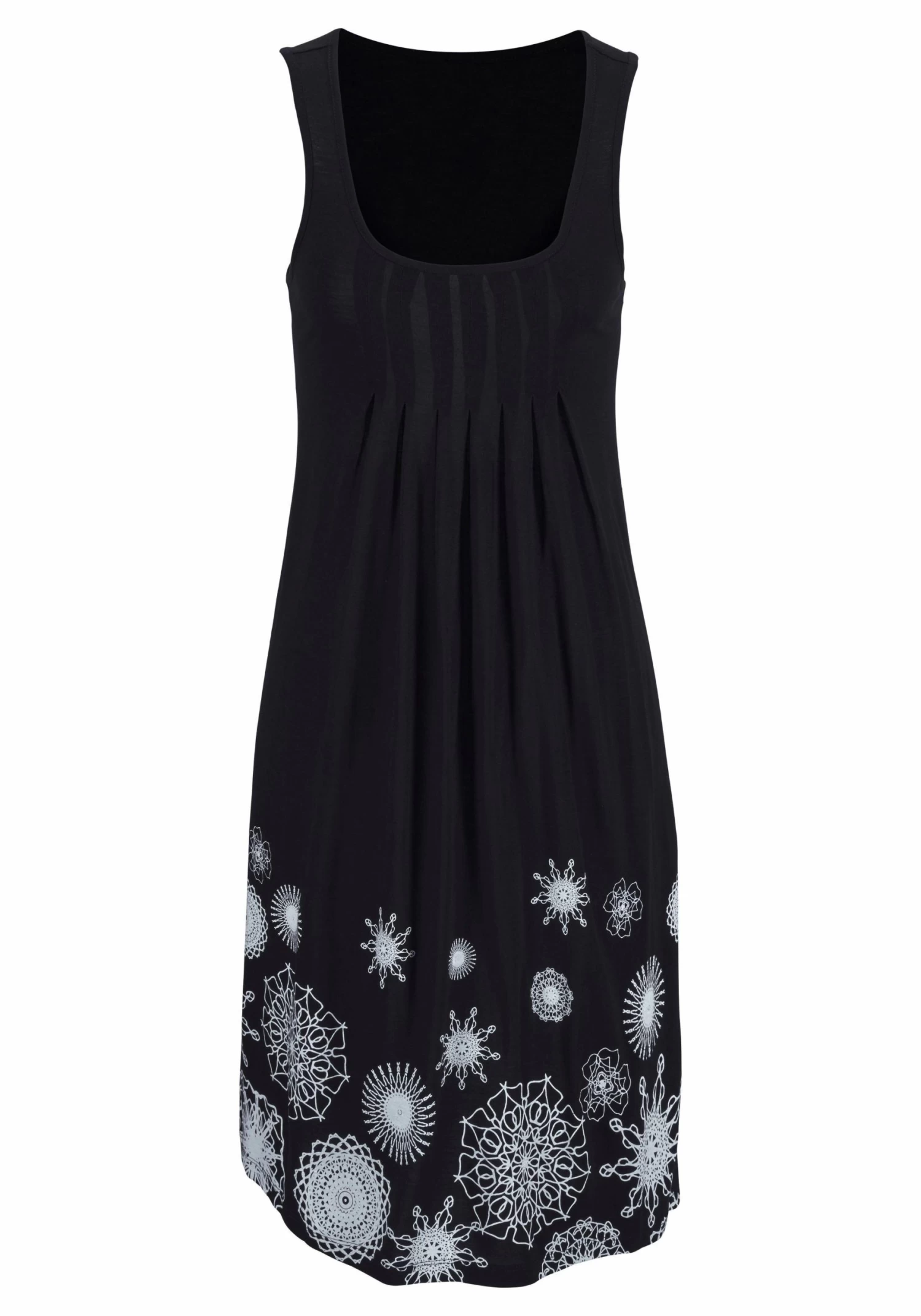 Overgooiermodel met ingelegde plooien onder de buste en mooie dessins op de rok. Zachte, soepelvallende kwaliteit. Lengte ca. 90 cm. Van 100% viscose.