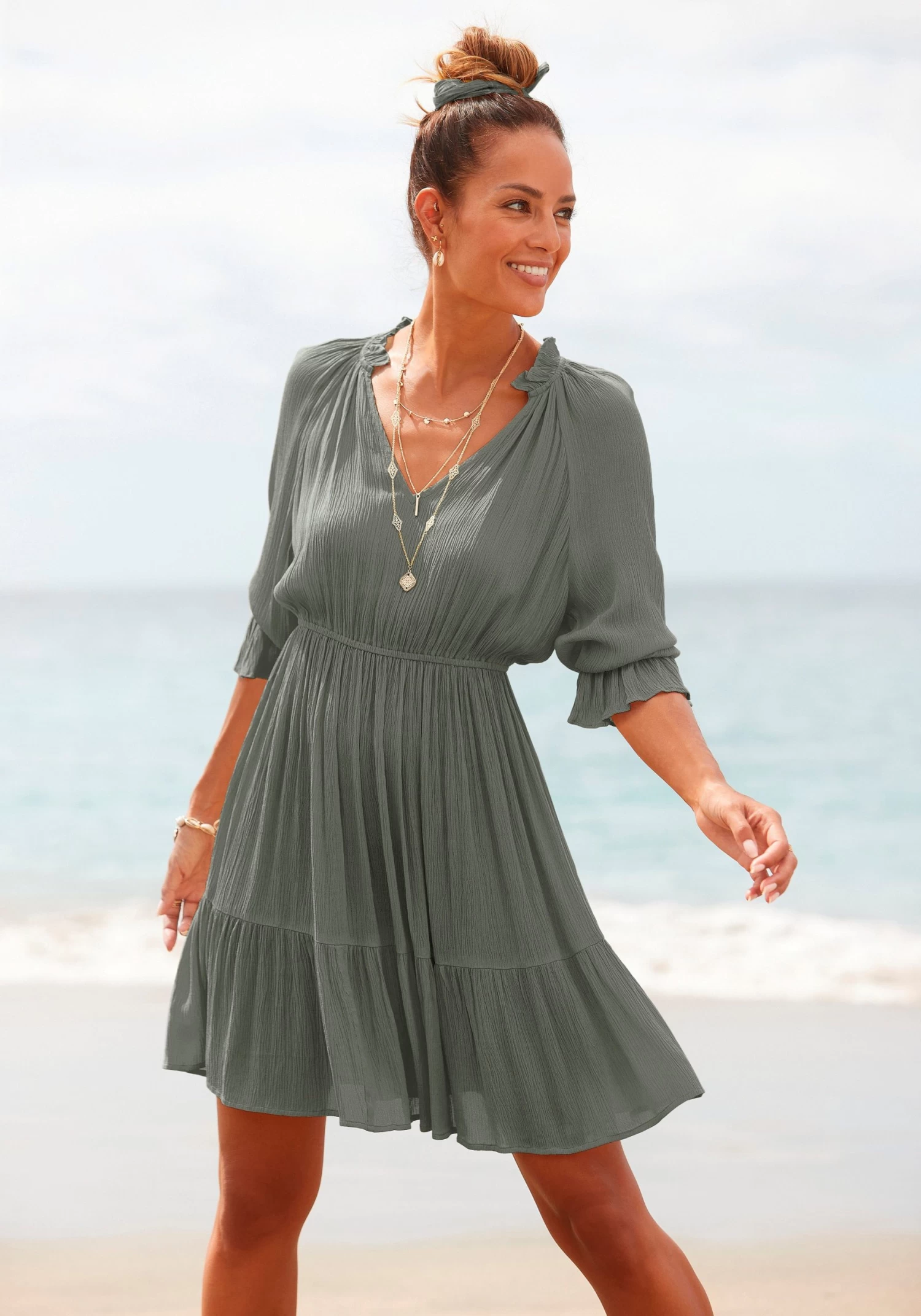 Met korte mouwen en steekzakken opzij. Sierbandjes bij de hals. Elk exemplaar is uniek. Binnenbeenlengte ca. 8 cm. Gedessineerde kwaliteit van 95% viscose, 5% Elastan.