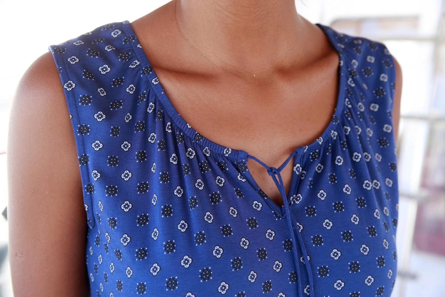 Met bindstrik bij de hals. Fijne allover-print. Gesmokte zoom.<br><br>Van 95% viscose, 5% Elastan.