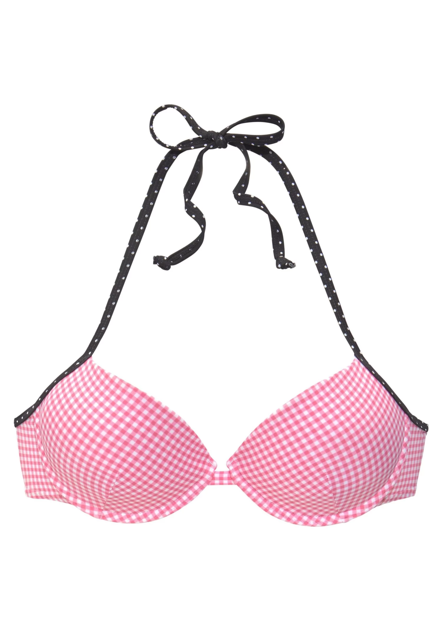 Met gewatteerde cups en uitneembare vullingen voor een sexy decollete. In haltermodel, in de nek te strikken en met rugsluiting. In een coole mix van vichyruitjes en stippeldessin. Van 80% polyamide, 20% Elastan (Lycra). Voering: 100% polyester.