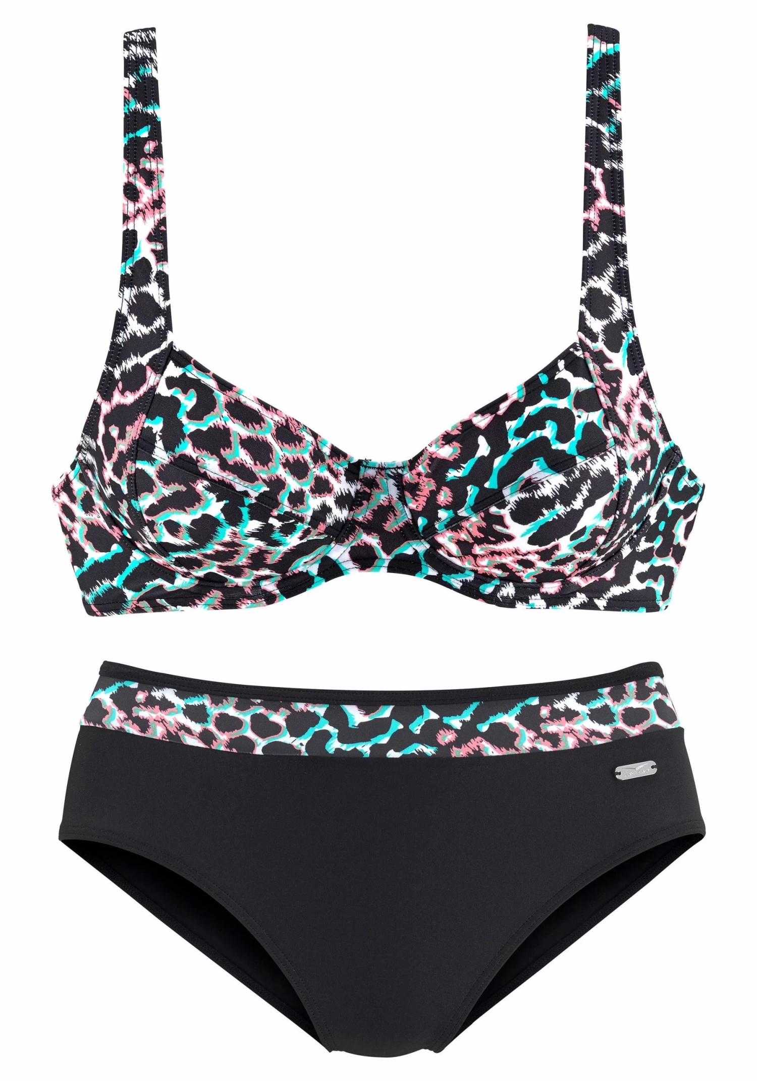 Leuke look in zwart composé, met kleurrijke luipaardprint. Top met verstelbare bandjes. Iets hoger verwerkt broekje met gedessineerde inzet bij de band. Modellerende versteviging opzij.<br><br>Van 80% polyamide, 20% Elastan. Voering: 100% polyamide. Beugelbikini. Modellerende versteviging: 85% polyamide, 15% Elastan.